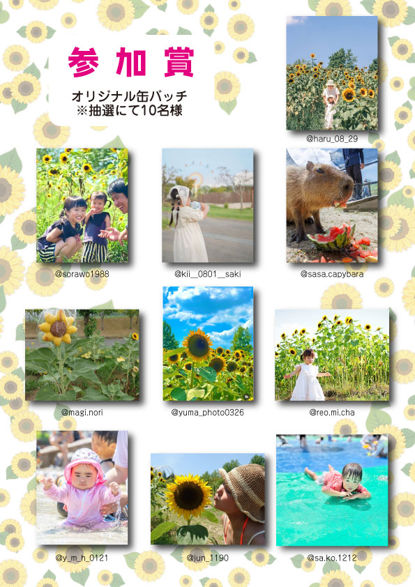 ■「ひまわり部門」は園内のヒマワリが写っている写真、「夏の思い出部門」はひまわり部門に選考されるもの以外の写真、を対象とさせていただきます。 部門分けについては入賞者選定の際に当園にて判断させていただきます。