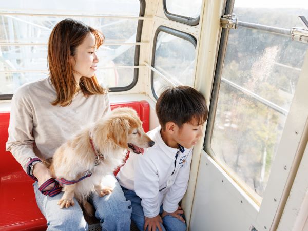 園内を走るハーベストトレインへのワンちゃん乗車と、最大の高さ36mの観覧車へのワンちゃんを連れての利用も可能!